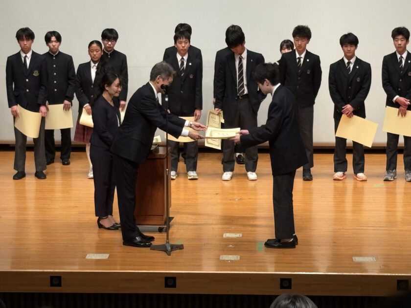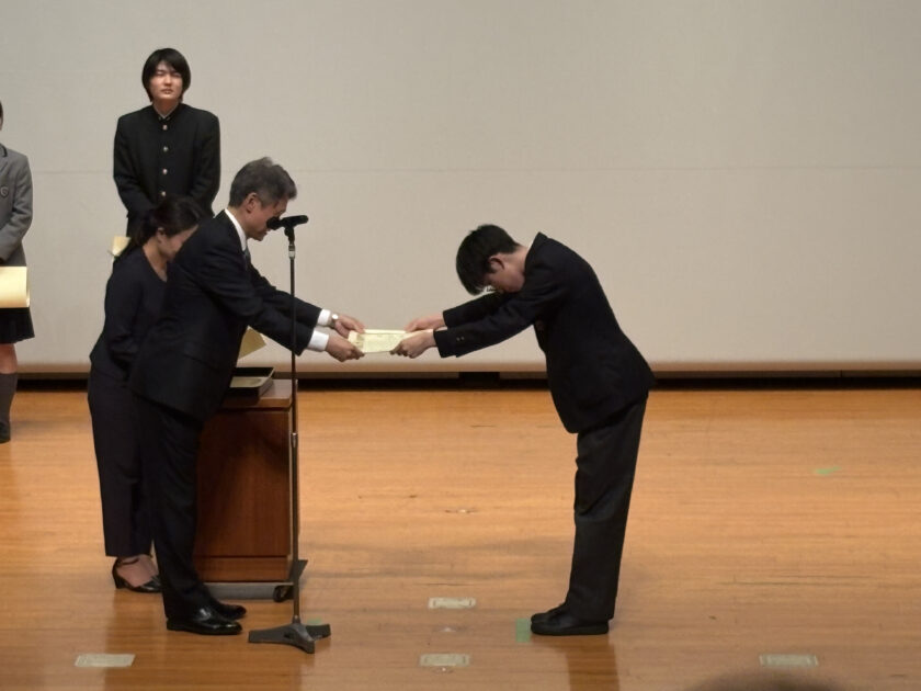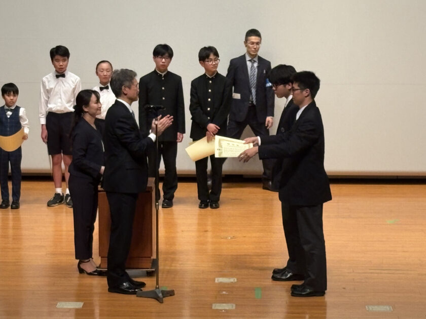 令和7年に都大会規模以上の行事で優秀な成績を収めた生徒・団体に対して、2月28日(土)に赤坂区民センターホールで「港区教育委員会表彰式」があり、写真部の加藤君(中二)、理科研究部の森山君(高2)、模型部(代表:高2福馬君、高1笠井君)が表彰されました。